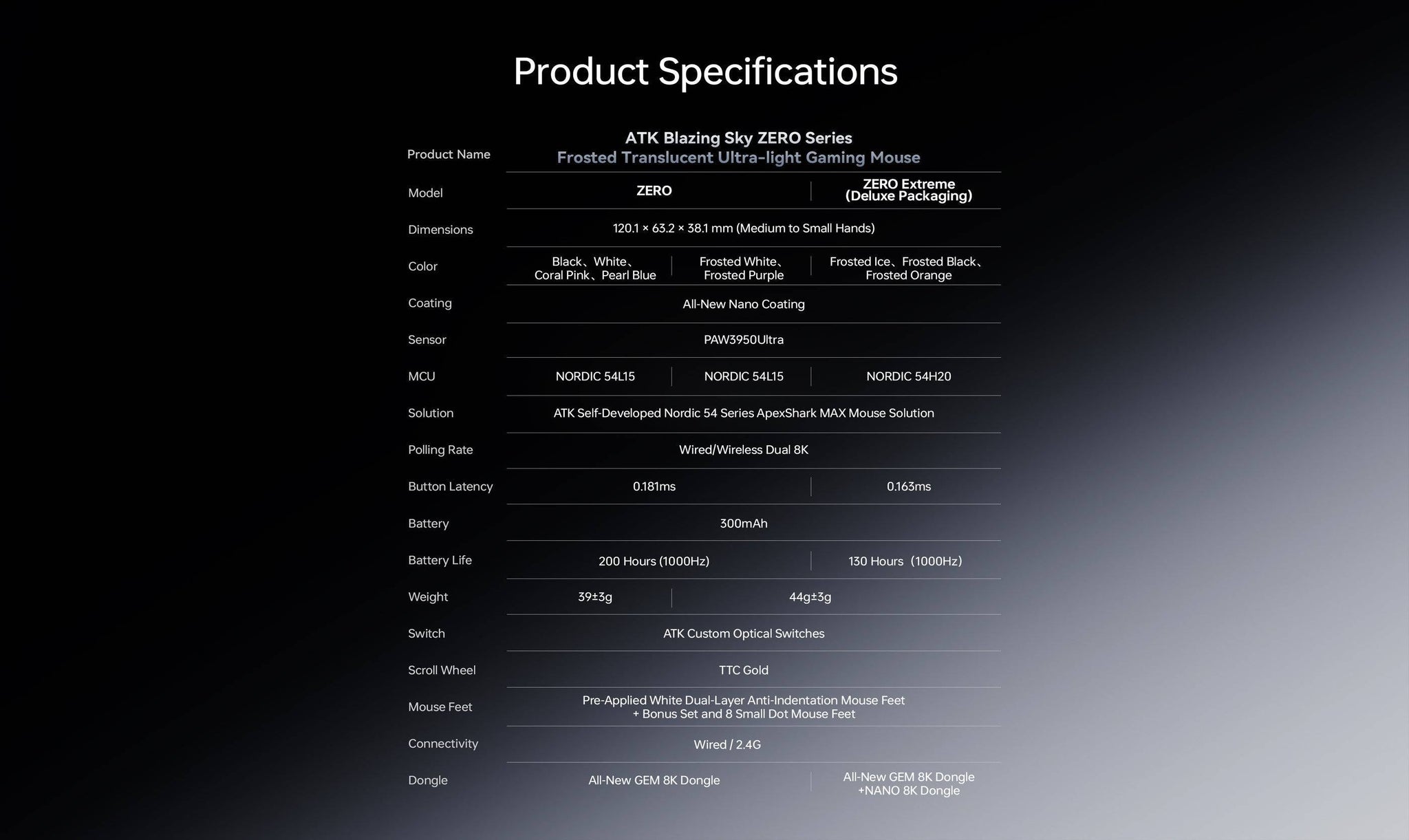 Neben der Standardversion existiert auch die ATK ZERO Extreme, die als Deluxe-Variante der Maus positioniert ist. Während die Grundarchitektur identisch bleibt – gleiche Form, gleicher Sensor und ebenfalls 8 kHz Polling Rate – richtet sich die Extreme-Version stärker an Enthusiasten, die maximale Performance und ein erweitertes Paket wünschen. Sie nutzt eine stärkere Nordic 54H20 MCU, wodurch eine noch geringere Klicklatenz erreicht wird (ca. 0,163 ms) und bringt ein etwas höheres Gewicht von etwa 44 ± 3 g mit sich. Zusätzlich wird sie mit einem erweiterten Lieferumfang ausgeliefert, etwa mit Premium-Verpackung, zusätzlichem Zubehör und teilweise einem zusätzlichen Nano-8K-Dongle.